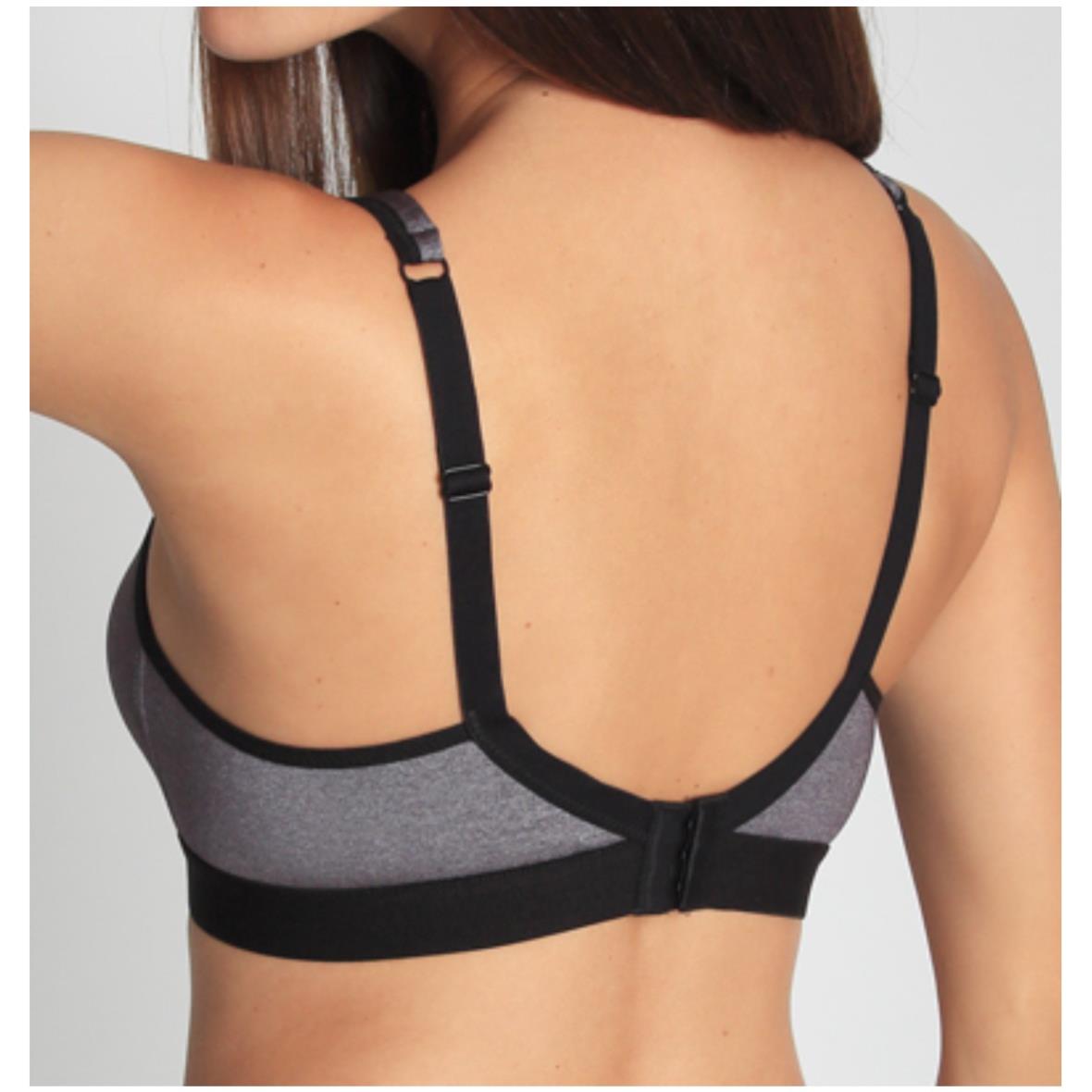 Doppelt vorgeformter, ungefütterter Light-Sport-BH aus atmungsaktiver Glanz-Microfaser in der Farbe Grau-Melange. Sehr guter Halt durch breite, über Kreuz liegende Gummibänder vorne sowie ein breites Unterbrustband und verstärkte Komfortträger.