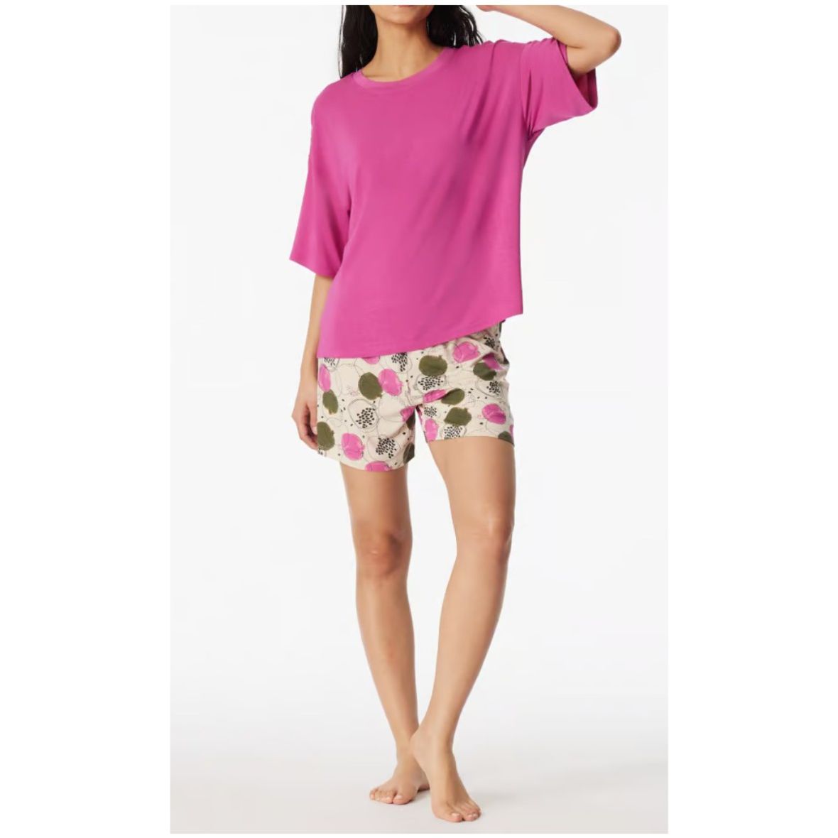 - kurzer Damenschlafanzug in Fuchsia, Creme und Grün, mit Granatapfel-Motiven auf Shirt und Hose