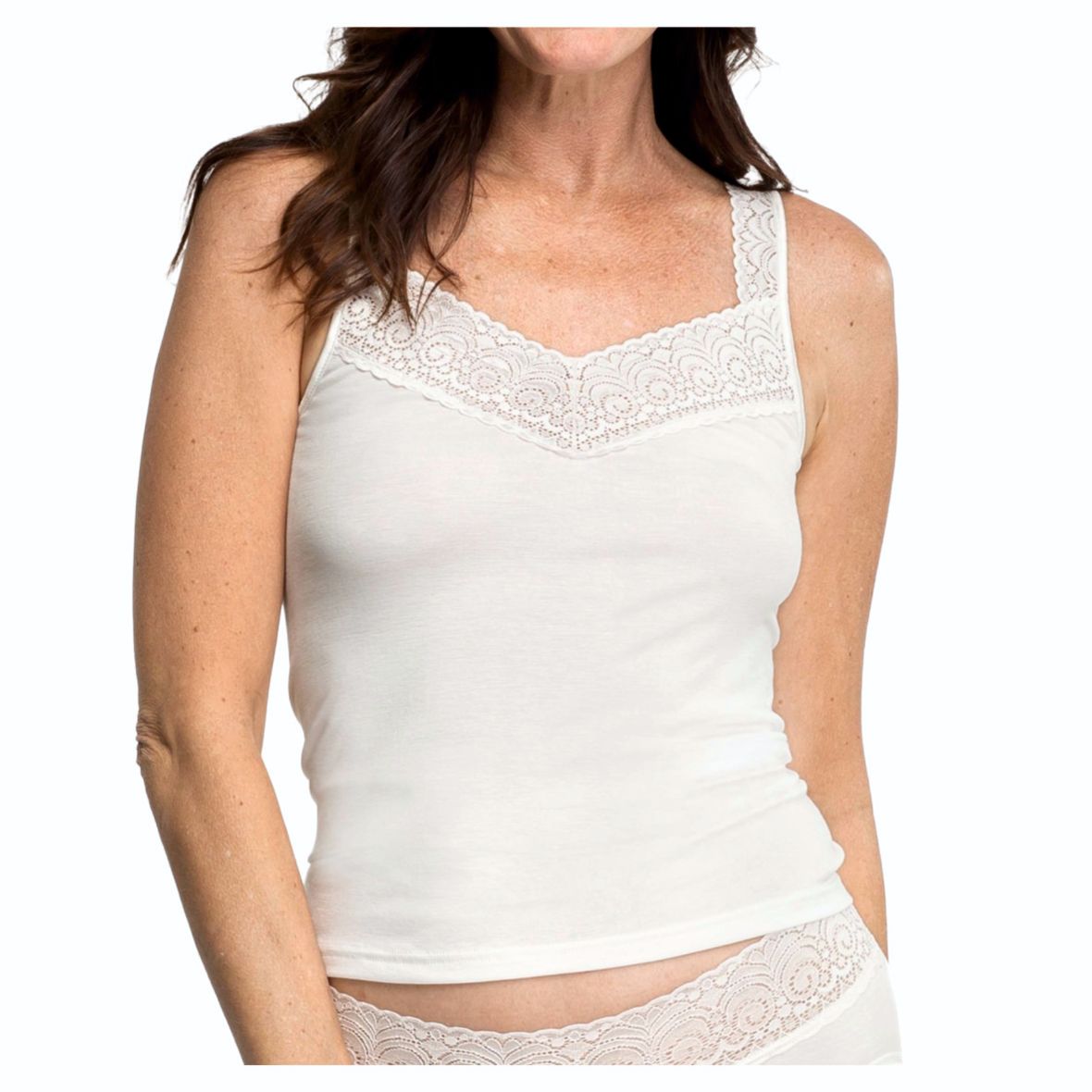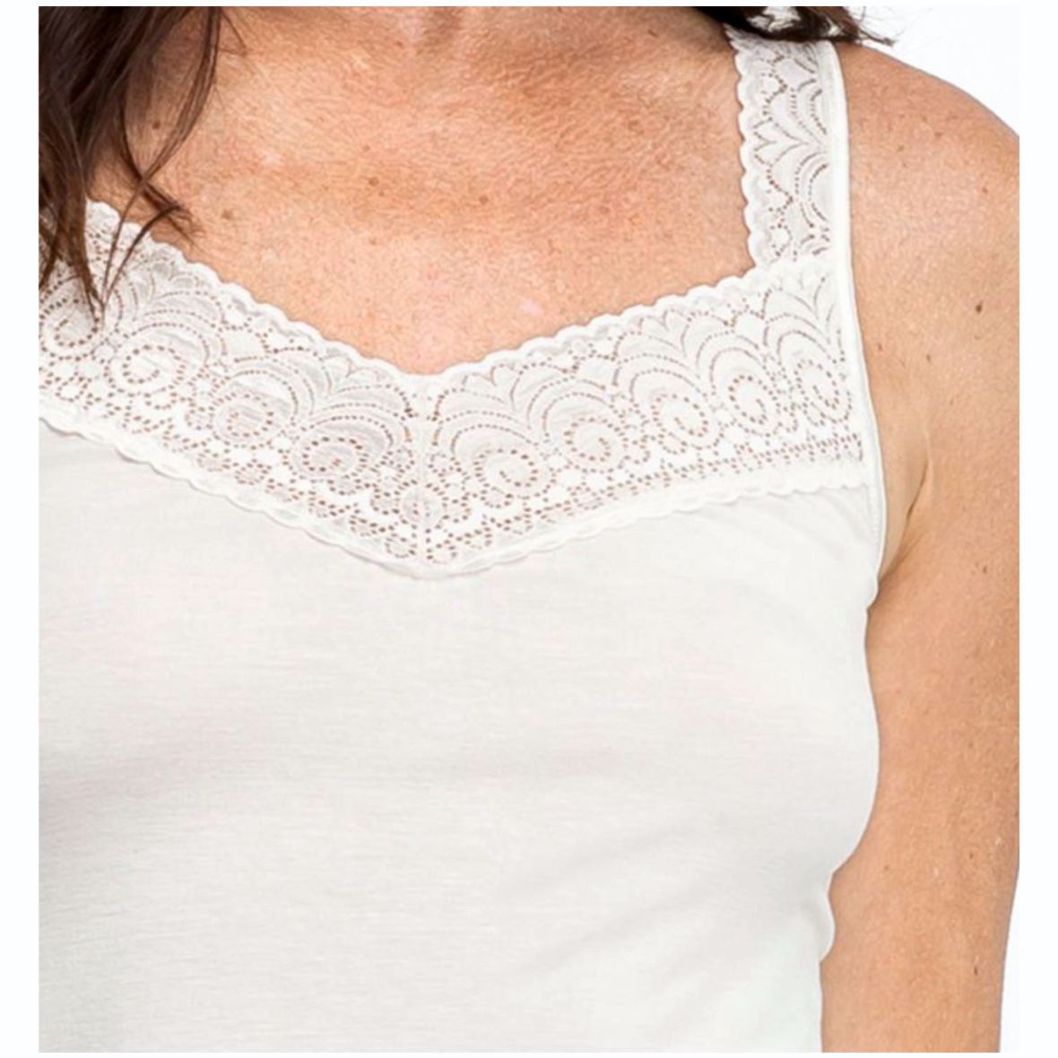 Das Achselhemd aus feiner Modalmischung entzückt durch seine Spitzendetails und wunderbar natürliche Materialzusammensetzung.