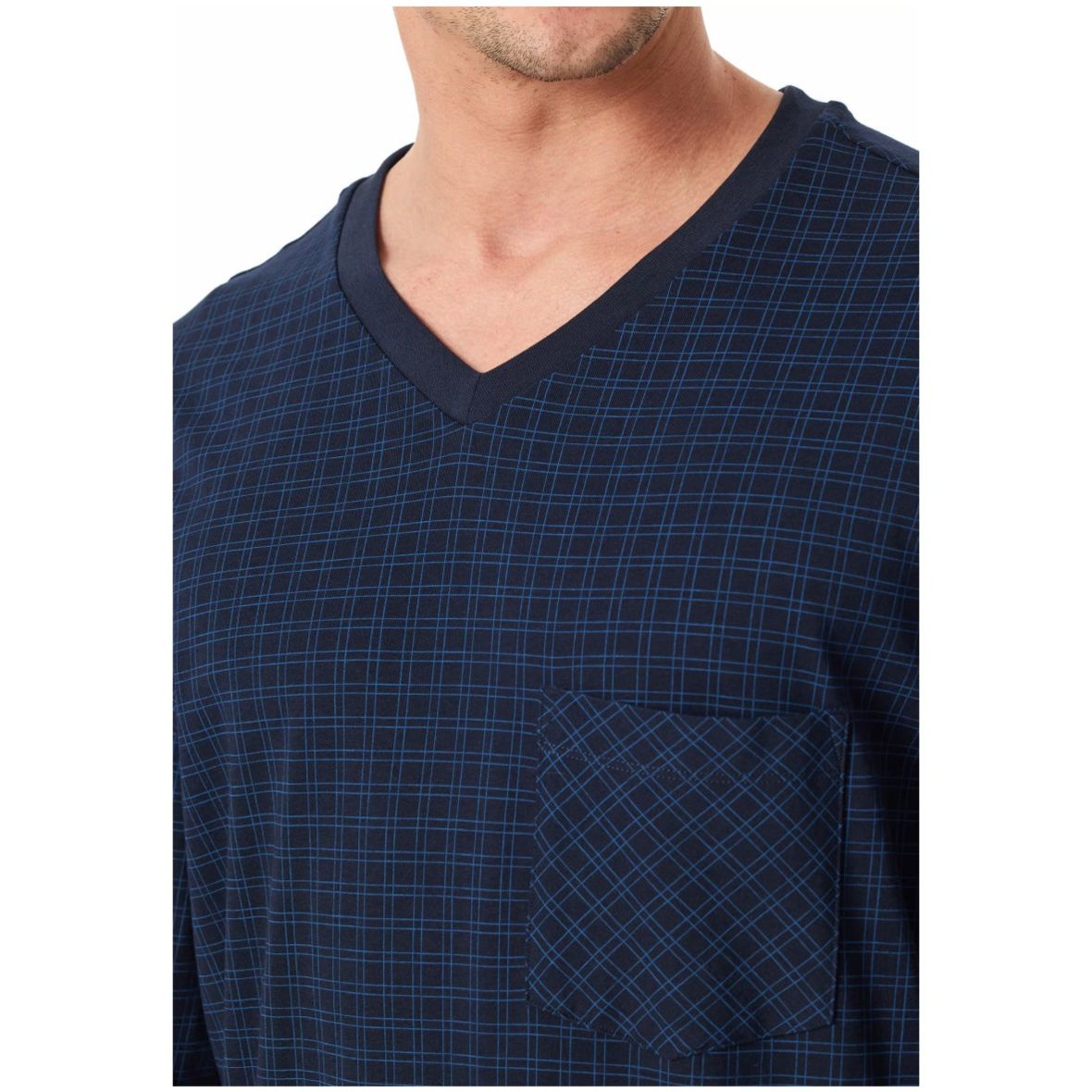 - langer, nachtblauer Herrenschlafanug mit kariertem Oberteil
