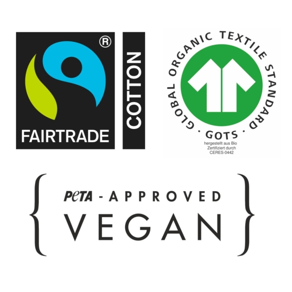Fairtrade, GOTS und PETA-Approved Vegan zertifiziert